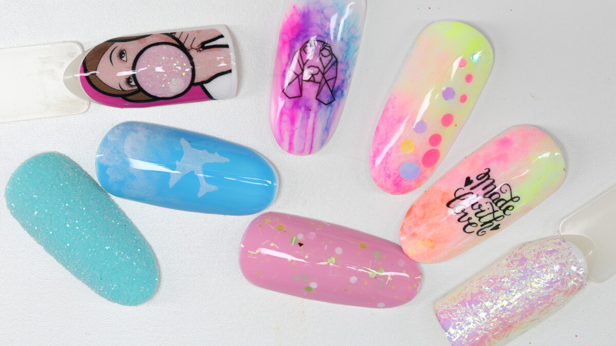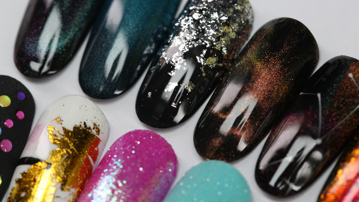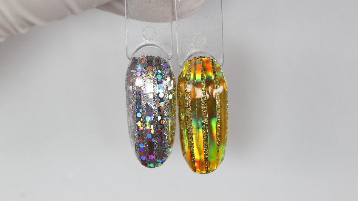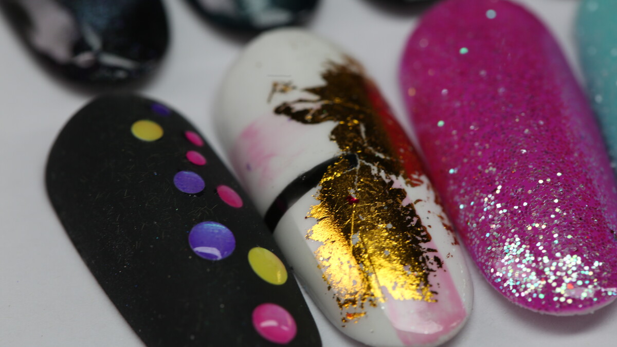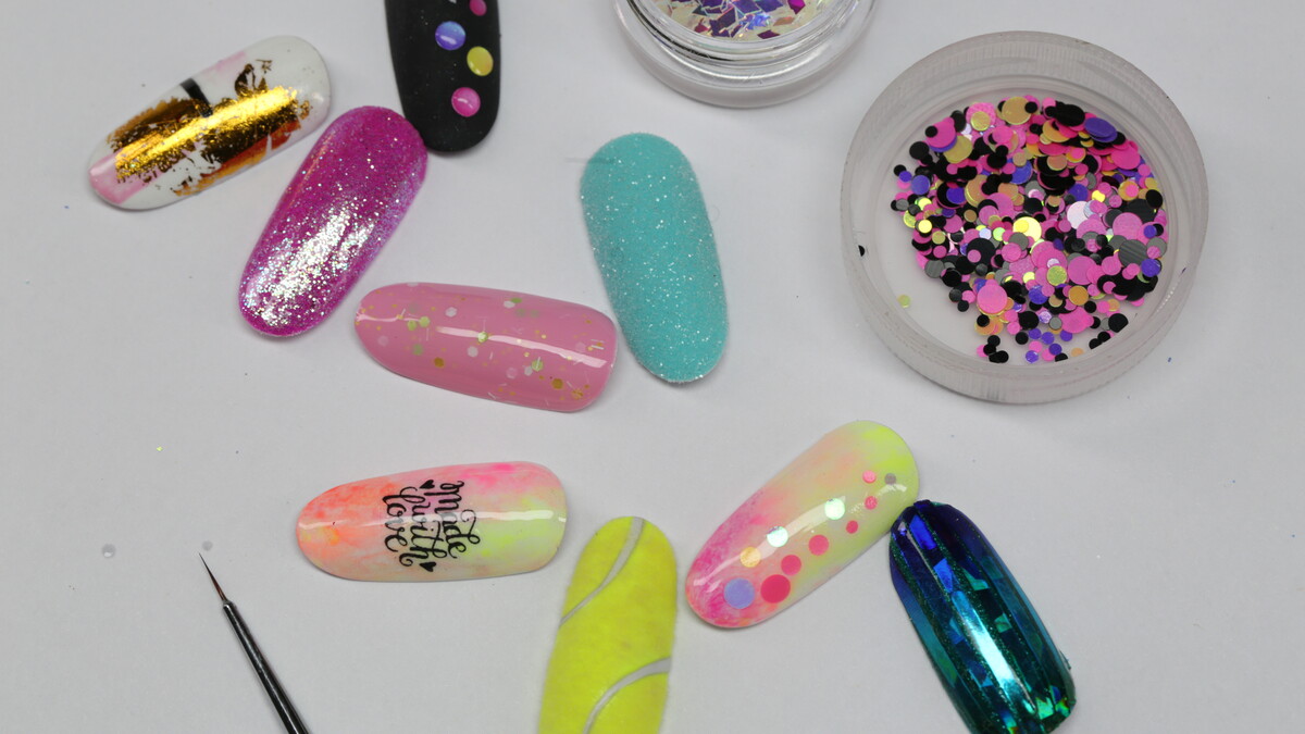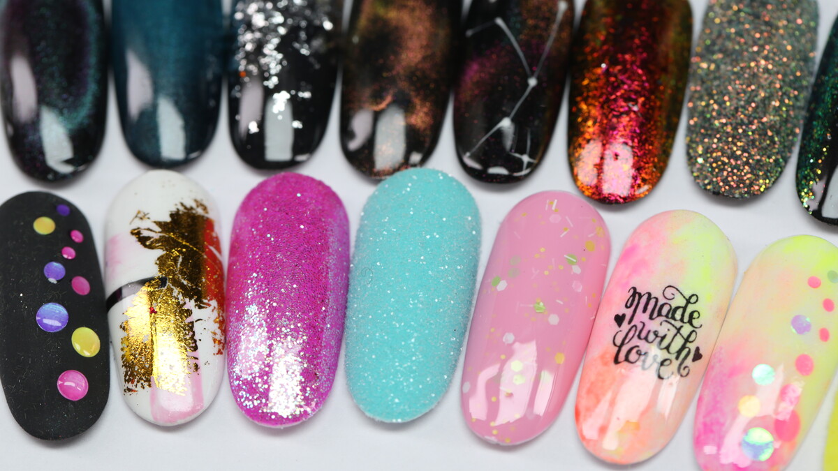 On this course we are going to learn simple design using different accessories - transfer foil, glitter, chrome powders, stencils, striping tape, magnet, sponge, flakes and more